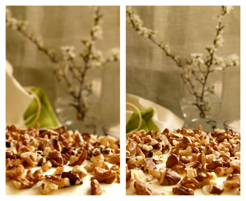Adornamos con nueces partidas en trozos. Aunque las posibilidades son infinitas: pueden ser nueces enteras, rodajas de piña caramelizada etc.
